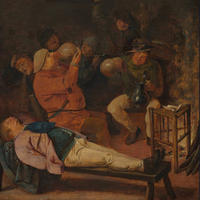 Adriaen Brouwer (c. 1605 – January 1638) was a Flemish painter active in Flanders and the Dutch Republic in the first half of the 17th century. Brouwer was an important innovator of genre painting through his vivid depictions of peasants, soldiers and other "lower class" individuals engaged in drinking, smoking, card or dice playing, fighting, music making etc. in taverns or rural settings. Brouwer contributed to the development of the genre of tronies, i.e. head or facial studies, which investigate varieties of expression. In his final year he produced a few landscapes of a tragic intensity. Brouwer's work had an important influence on the next generation of Flemish and Dutch genre painters. Although Brouwer produced only a small body of work, Dutch masters Peter Paul Rubens and Rembrandt collected it.