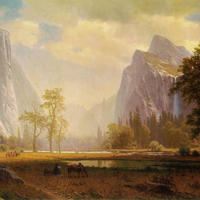 Bierstadt was born in Prussia, but his family moved to the United States when he was one year old. He returned to study painting for several years in Düsseldorf. He became part of the second generation of the Hudson River School in New York, an informal group of like-minded painters who started painting along the Hudson River. Their style was based on carefully detailed paintings with romantic, almost glowing lighting, sometimes called luminism. Bierstadt was an important interpreter of the western landscape, and he is also grouped with the Rocky Mountain School.