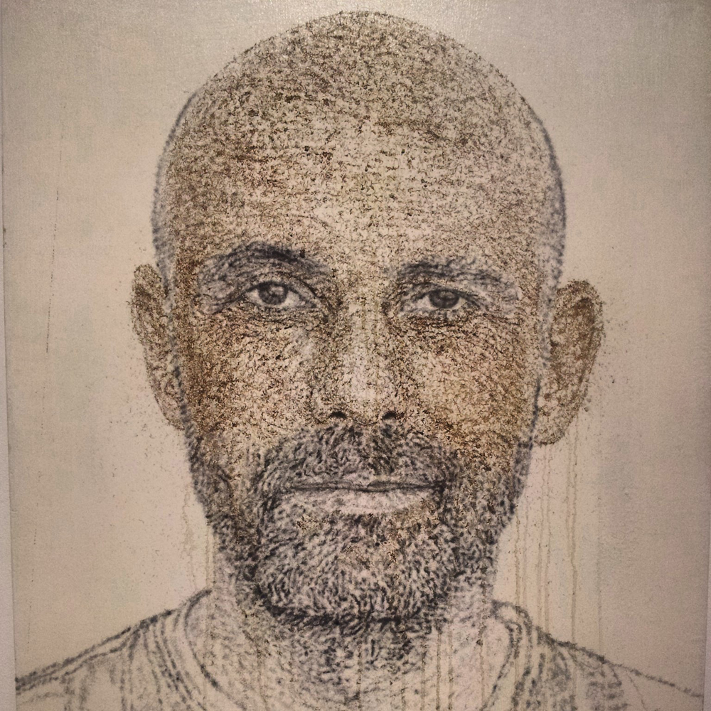 His self portrait is made of steel wool. In real life his eyes are blue, but there is no blue steel wool.