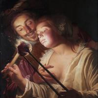 Returning to the Netherlands having networked with the Medicis and other big-cheese patrons, van Honthorst became one of the more aesthetically conservative of the Utrecht Caravaggisti, a group of painters working in the style of Caravaggio, like a Renaissance cover band. As one of the Caravaggisti, van Honthorst made Dutch painting more realistic and experimented with artificial light, especially candlelight, to resounding critical success. He abandoned the Caravaggisti in the 1630s, focusing on a more classical style for his many royal patrons, and composing a self-portrait to complement a portrait of his wife.