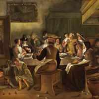 Steen went to the same school as Rembrandt, and there must be something in the water there because he picked up the art bug, too.  In 1684, Steen and Gabriël Metsu founded the Painters' Guild of Saint Luke at Leiden. Shortly after, he moved in with artist Jan van Goyen and, with the speed of a cheetah, swept up the man’s daughter and married her. Then, just like his parents, he had eight kids and ran a brewery.  When the art market was decent, he continued to paint.  But a bunch of tragedies befell Steen in a short number of years.  His wife died in 1669, his father died in 1670, and the art market collapsed in 1672--the Year of Disaster.  Following the collapse, Steen opened a tavern, remarried and became president of the Saint Lucas Guild.  Life goes in circles.