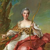 Almost always wearing a close, powdered hairdo sprinkled with flowers, his sitters are usually depicted in one of three standard formats, either a bust, a half view, or the grander ¾ view. He had two main styles. In the first, he painted his sitters in full contemporary courtly dress, taking special care with the satin fabrics and other luxurious accoutrements. In the second (and his favorite) style, he painted the sitter in the guise of a classical goddess, surrounded by the goddess’s attributes and posed before evocative palatial columns. This latter style became known as the allegorical portrait, and was a kind of compromise between history painting and portraiture. It was a way for Nattier to infuse his portraits with some of the elements of history painting, which the Academy considered nobler than portraiture, while still lining his own pockets.