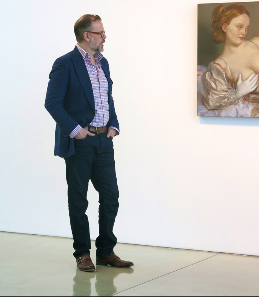 John Currin (born 1962) is an American painter based in New York City. He is most recognised for his technically proficient satirical figurative paintings that explore controversial sexual and societal topics. His work shows a wide range of influences, including sources as diverse as the Renaissance, popular culture magazines, and contemporary fashion models. He often distorts or exaggerates the erotic forms of the female body, and has stressed that his characters are reflections of himself rather than inspired by real people.