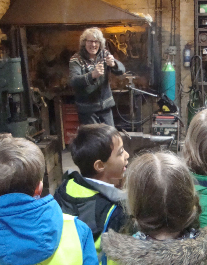 The man seriously loves kids. He's worked with groups of them on many of his decorative work (bridges, clock-towers, and gates and railings for public buildings and schools). The kids get to fire up the plasma-cutter and stick things in the iron forge, and even more fun, quench the hot work in buckets of water.