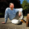 I like the perspective on this piece of art. From this perspective it looks like just a normal photo of a public park. If you look close enough you see the upper part of a mans body on the road. Although it is the closest thing to you in the photo, the perspective this was taken in, does not draw attention to it. It is a very random placement, and a very random object. The perspective makes you enjoy the whole photo, without drawing your attention immediately to the random piece of art. I also enjoy the cool colors used in this photo.