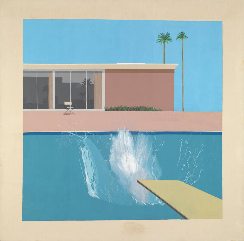 A Bigger Splash is a large pop art painting by British artist David Hockney. Measuring 242.5 centimetres (95.5 in) by 243.9 centimetres (96.0 in), it depicts a swimming pool beside a modern house, disturbed by a large splash of water created by an unseen figure who has apparently just jumped in from a diving board. It was painted in California between April and June 1967, when Hockney was teaching at the University of California, Berkeley. Jack Hazan's fictionalised 1973 biopic, A Bigger Splash, concentrating on the breakup of Hockney's relationship with Peter Schlesinger, was named after the painting.