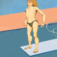 Knowing David Hockney, it was probably a he. Pictures of buff, tan dudes he saw in Physique Pictorial were quintessentially California for Hockney, and left him yearning to experience Los Angeles for himself. In his mind, LA was the land of laid-back, glamorous and amorous people. And swimming pools became a symbol of that luxury and indulgence in his series of pool paintings. Hockney himself says he was fascinated with the idea of taking two weeks to paint something that only lasts two seconds. But I wonder David, if this could also be about other, far more pleasurable moments that only last a few seconds? Could it be, dare I say, a Freudian drip?
