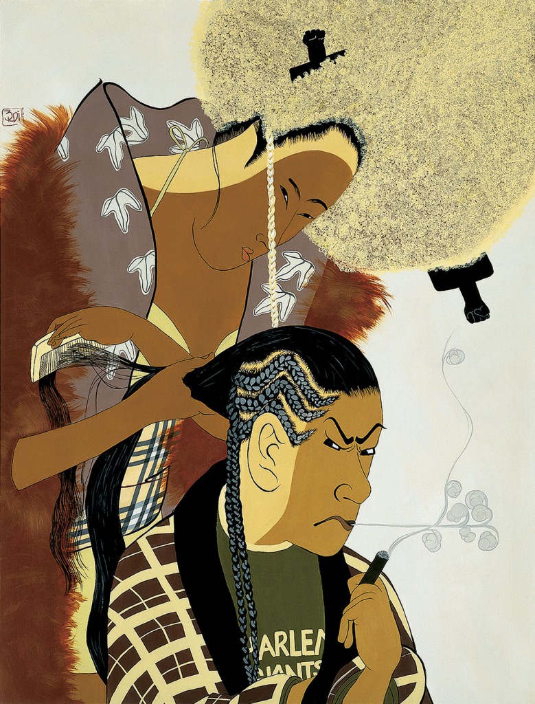 It is intriguging to see that Iona painted in japanese style as well. The painting also brings out the fact that not only did Japanese dress like African Americans, they went to the extent to paint themselves like them. The painting shows, like Browne said, that they had no real understanding of African American culture. They simply did it because it was trend.