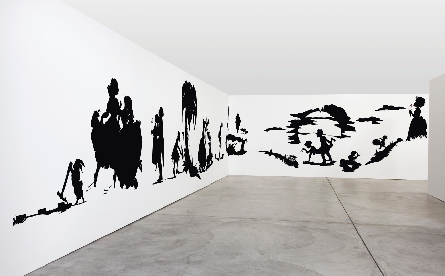 Like most of Walker’s famed cut paper silhouette installations, African’t details gruesome and fanciful depictions of race relations in the antebellum South and colonial Africa.