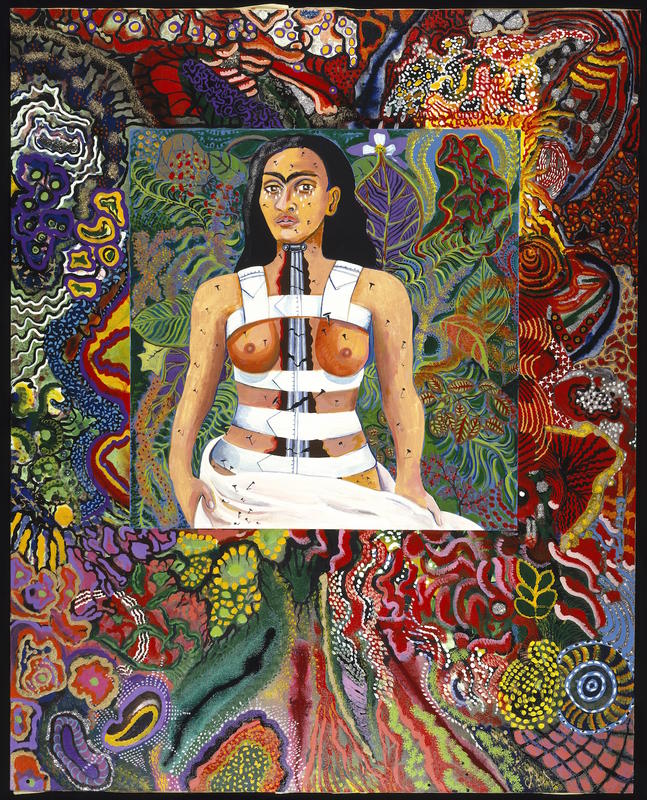 That’s exactly what she did for Agony in the Garden. She painted one of Frida Kahlo’s most personal and painful self portraits, Broken Column, but replaced the background with floral patterns, her own signature style.