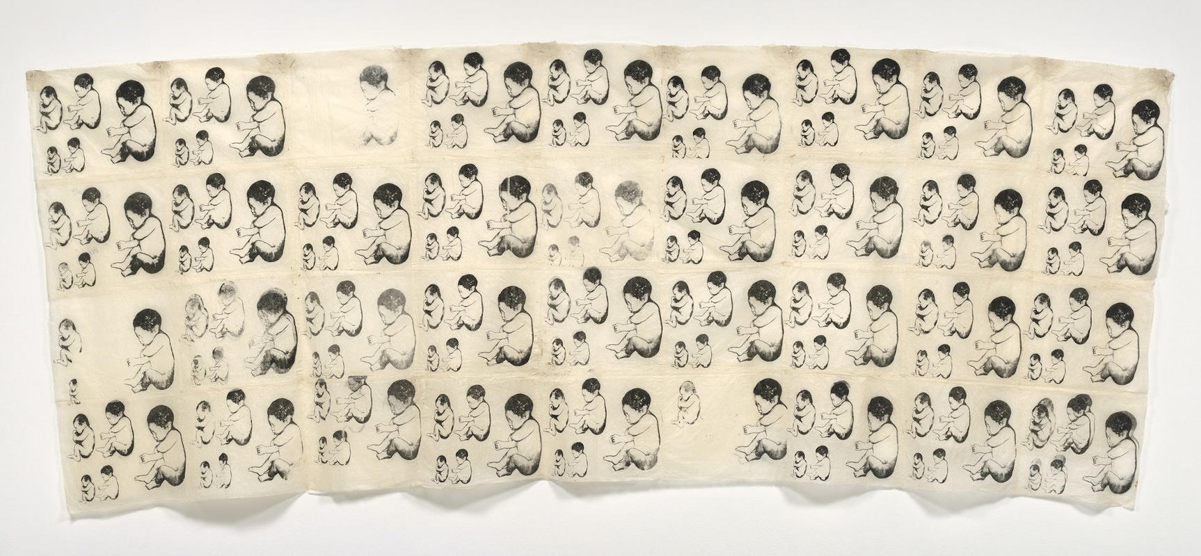 The piece consists of “36 screenprints of a fetus Smith found in a Japanese anatomy book, printed on handmade sheets of Thai paper, attached one to the other, and suspended from the wall.” The title indicates that this piece is like a long, winding line (like the infuriating ones at Disneyland) of babies waiting for souls, which is pretty cute. What well-mannered, considerate babies they are! And like real babies, no two are exactly alike, despite having all come from one picture. The entire piece is a beast at 15 feet long and 6 feet tall. It’s unframed (probably because who could make a frame that size?) and hangs like a scarier version of those chill mandala tapestries that can be found in dorm rooms across America.