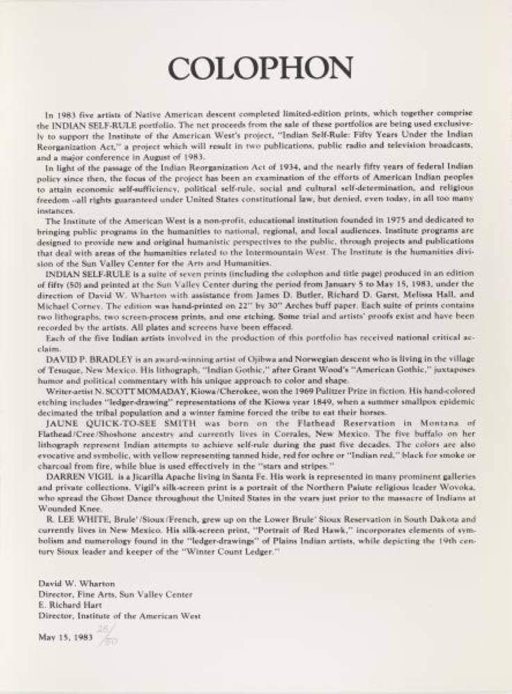 Besides Bradley, the other artists (and writer) were Jaune Quick-to-See Smith, (Untitled); Scott Momaday, (Kiowa Year 1849); Randy Lee White, (Red Hawk’s Portrait) and Darren Vigil, Portrait of Wovoka). The portfolio helped to produce a documentary, Indian Self-Rule: A Problem of History, based on the 1983 conference, as well as more than 100 fellowships that provided a way for people to attend the conference. A book published in 1986, Indian Self Rule: First-Hand Accounts of Indian-White Relations from Roosevelt to Reagan, uses Bradley’s American Indian Gothic, on the front cover.