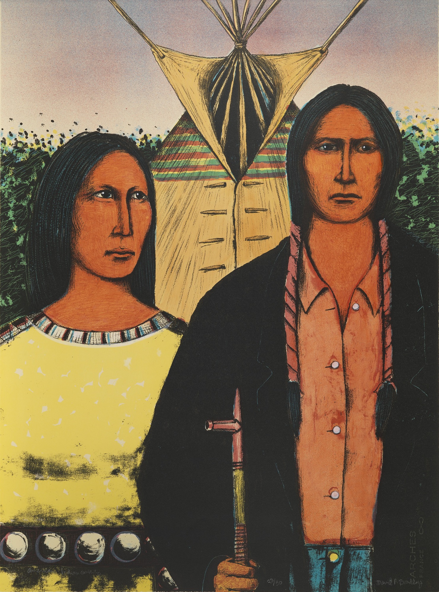 Bradley has also used the American Gothic theme in other works, such as the quirky American Gothic: O'Keeffe and Stieglitz Meet Tonto and the Lone Ranger, American Indian Gothic-Apache, American Indian Gothic, Ghost Dancer, American Gothic [with Tonto and the Lone Ranger], and at least one more American Gothic. Compared to some of his other work, the Gothic from the portfolio is pretty subtle; it’s also one of the earlier versions to use this idea. Bradley’s Gothic series is considered a critique of the “American regionalist” style of painting, and by offering alternative people in that familiar setting, it suggests the broadening of our understanding of what America looks like, and which people are memorialized in iconic works of art. From his artist statement in Indian Country: “My art suggests and comments on situations but does not resolve them.”
