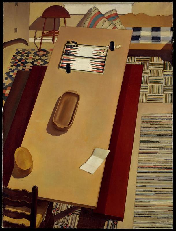 The comfy sofa. The multitude of rugs. And the set of backgammon on the table. The attention to detail Sheeler puts in his patterns is something to take note of. The rugs, the pillows and throw on the sofa, and the backgammon set all have entirely different and sharp patterns. But these erratic patterns do a lot of the legwork in making the viewer feel at home. These are versions of things that people would have had in their own houses at some point. Sheeler is trying to tap into a form of national pride with all of this, hoping to stoke the same sentiment into the eyes and hearts of the audience.
