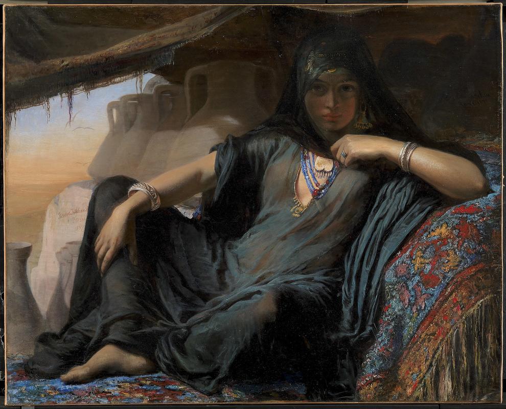 The Pot Seller at Gizeh is based on an earlier painting, Pottery Seller, from 1876, in which the woman is posed in a similar lounging position. In the 19th century, when women were painted in lying down like this (again, usually by male painters), it was assumed that they were prostitutes, as in Édouard Manet’s Olympia. Pot Seller is no Olympia, but there is definitely a sexual undertone to the image. That being said, Baumann may have also been trying to convey the image of a self-assured, independent woman who is “not prepared to simply be a sex object, but who has strong self-esteem,” as curator Peter Nørgaard Larsen has put it.