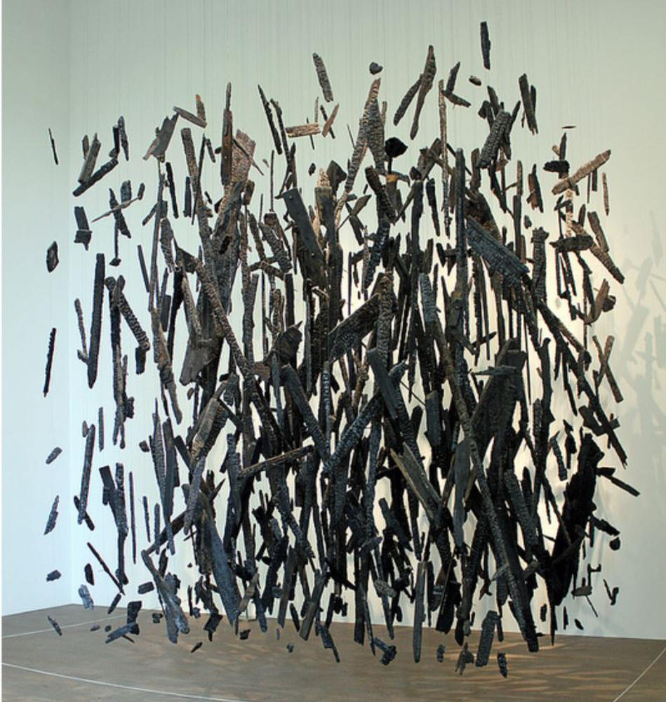 Cornelia Parker’s floating installation Anti-Mass looks a lot like the charred logs of a behemoth beach bonfire, levitating under the Wingardium Leviosa spell.