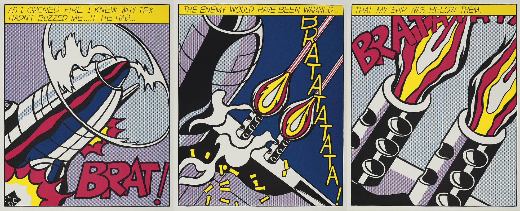 - “Roy Lichtenstein, As I Opened Fire.” Artsy. Accessed April 30, 2018. https://www.artsy.net/artwork/roy-lichtenstein-as-i-opened-fire-triptych.