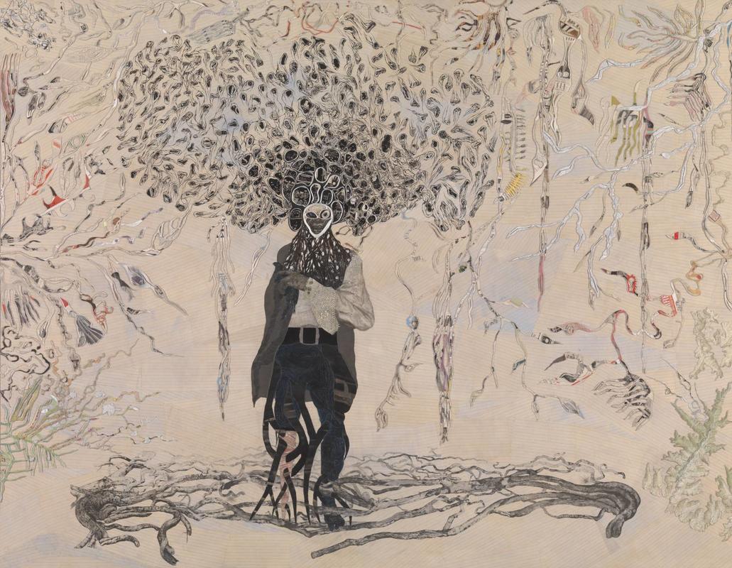 This combination of science fiction and African diasporic themes, commonly referred to as Afrofuturism, can be found in the work of many contemporary Black artists, including Gallagher, Wangechi Mutu, Kerry James Marshall, and Robert Pruitt. If you take a look at Mutu’s She’s Egungun Again (2005), you might notice that it shares a few aesthetic similarities with Bird in Hand. Both depict a humanoid figure composed from layers of different media, with Bird in Hand pieced together from materials as diverse as newspaper advertisements, plasticine, Himalayan rock salt, maps, gold leaf, and silver paint, and She’s Egungun Again partially composed from cut-up pornographic magazines. Both figures also appear to be sprouting some sort of organic material from their bodies; in the case of Bird in Hand, this material resembles an underwater ecosystem, while the textures in She’s Egungun Again are evocative of grass, roots, and lichen. The artists’ depiction of the growth of new life from these fantastical, collaged bodies speaks to one of the aims of Afrofuturism—to envision what the future of Black life looks like, using as its language a fusion of mythology, technology, and bits and pieces of history, cut apart and refashioned into something entirely new.