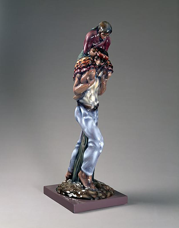 Like many of Jimenez’s pieces, it’s made of fiberglass. The material is found in insulation and in the body of cars, especially in bodies of cars from the 1960s-1970s, which feature heavily in lowrider shows. I bet if you put your ear to the sculpture close enough, you can hear the Chicano rock and snippets of War’s “Low Rider” playing faintly. The sculpture is also made in a way that evokes Catholic imagery, specifically of Jesus, Mary, and Joseph’s flight to Egypt to escape King Herod’s purge.
