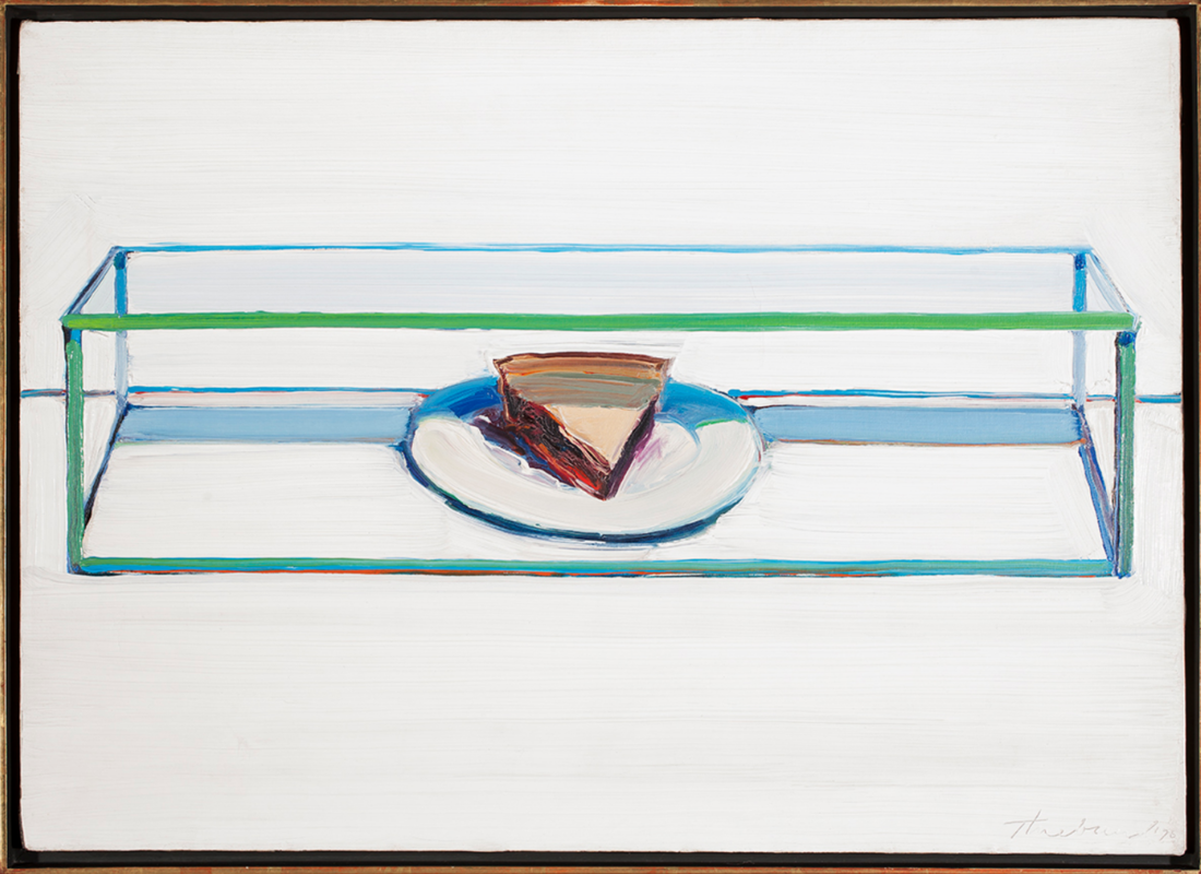 A young boy is on his paper route smushing his face against the window of a bakery, not unlike the art of both Pipilotti Rist and Ana Mendieta, ogling at some pie perfection. Young Wayne Thiebaud (pronounced Tee-bow but no relation to the uber-religious football quarterback, Tim Tebow) was born in the 1920s and what do young boys who were born in the 20s do? They get a paper route. I guess it was a right of passage thing because seemingly every American man over the age of 80 had a paper route at one time in his life. Little Wayne (not to be confused with Lil' Wayne, they are very different people.) would go on his paper route and somewhere along the way he would find a bakery and ogle at the caged pies in the window. He remembers the frustration with not being able to “get at ‘em.” From this pent-up adolescent rage was born the painting, Caged Pie and many, many other pie paintings.