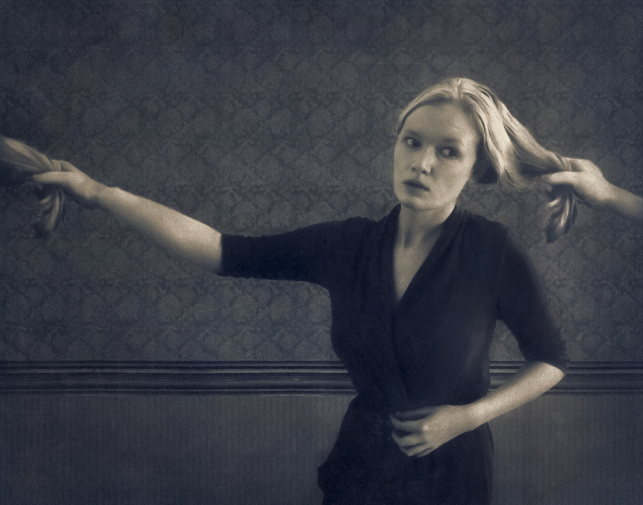 In Captive, Powell stages a scene of a woman pulling someone’s hair while her hair is also being pulled by an unknown hand. The action creates the illusion of the woman pulling her own hair outside the frame, producing a repeated optical illusion reminiscent of M. C. Escher. The woman seems to have even frightened herself with this action, being pulled backwards with a surprised expression. As dreams often give us a subconscious context for your deeper feelings, Powell seems to be representing the feeling of holding yourself back. In the images, Powell uses self-portraiture to create the sequences. Each image tells its own story while the larger series gives context to the relationship between the subconscious, waking world, and the psyche.