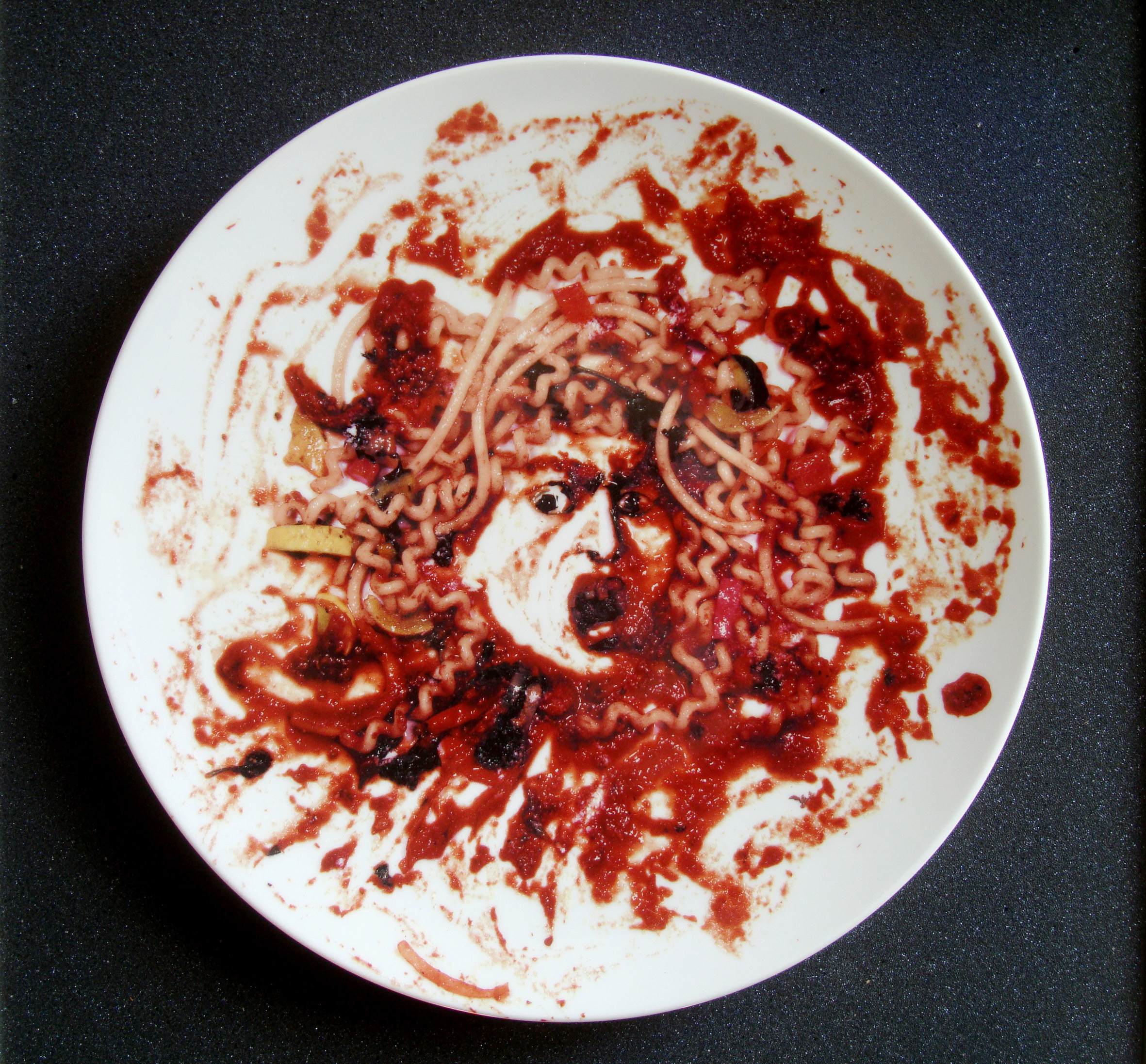 This work is an ode to Caravaggio’s gruesome Medusa. A bit more jovial, Muniz’s rendition was created out of marinara, which he then photographed and digitally printed on plates. His mother obviously never taught him not to play with his food. We will give him a pass though, for the ooey gooey red sludge of the marinara seems to enhance the mess that comes with the business of decapitating a monster.