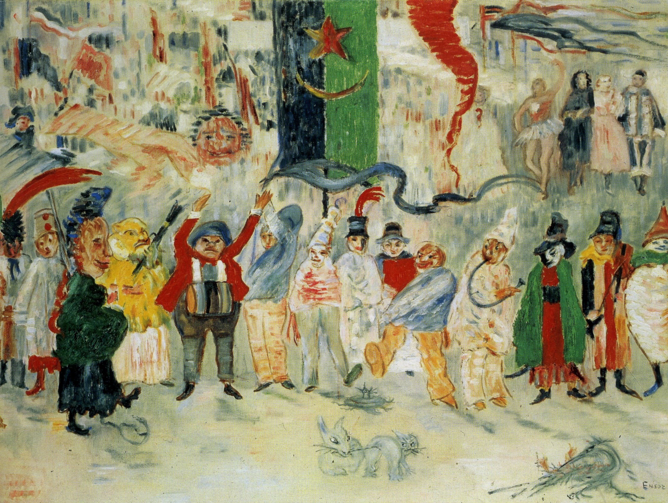 Ensor’s quirks— and those of Carnaval en Flandre— are perhaps best justified by an unconventional childhood. Ensor was raised in a souvenir shop that sold Carnival masks, seashells, and stuffed fishes to tourists. This treasury of oddities also housed an assortment of family pets, including cats, parrots, and a lone monkey. Surrounded by a wonderland of trinkets and peculiarities, it’s little wonder that Ensor developed a fondness for bright colors, Carnival imagery, and most everything unconventional.