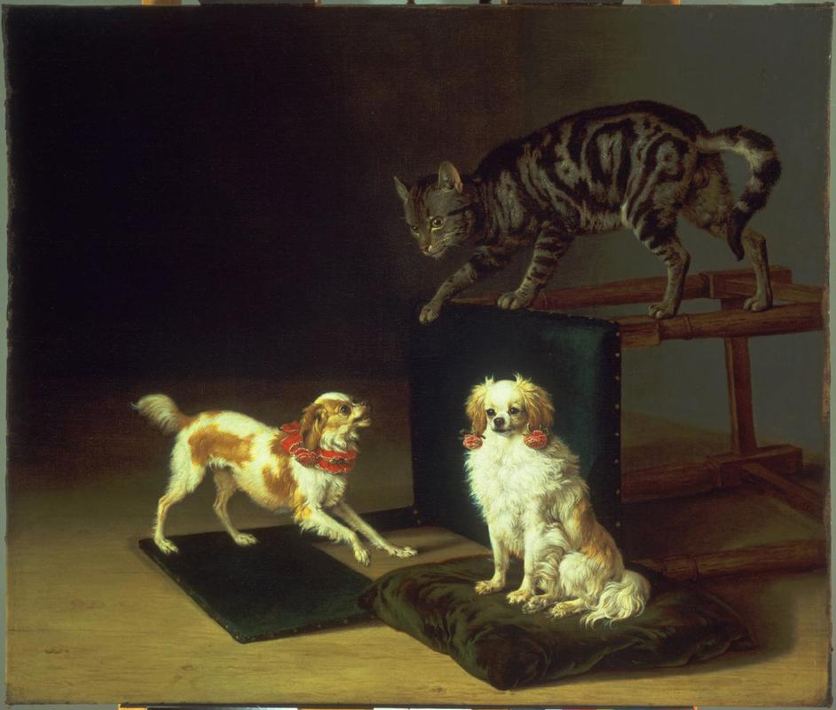 With a war this long, you’d be a fool to think that Dutch didn’t have any deep-seated feelings towards the Spanish. Ending just four years before Paulus Potter painted this, the Eighty Years’ War was still very fresh in the collective Dutch psyche. Coupled with the bravado of the newly-victorious Dutch, the time was ripe for a weirdly assertive painting of pets. A political reading of this painting declares that the cat represents the strength and cunning of Holland, and the two dogs are stand-ins for Spain - and not in a nice way. Seventeenth-century Dutch people called spaniels Spanish dogs, and one spaniel is wearing a pair of earrings that would have been the height of contemporary Spanish fashion. The dogs are definitely cute, but that’s not the point. Potter wants us to understand that these floofy boys are no match for the cat’s wit - a bold statement of the strength of the Netherlands after centuries of getting the beatdown from Spain.