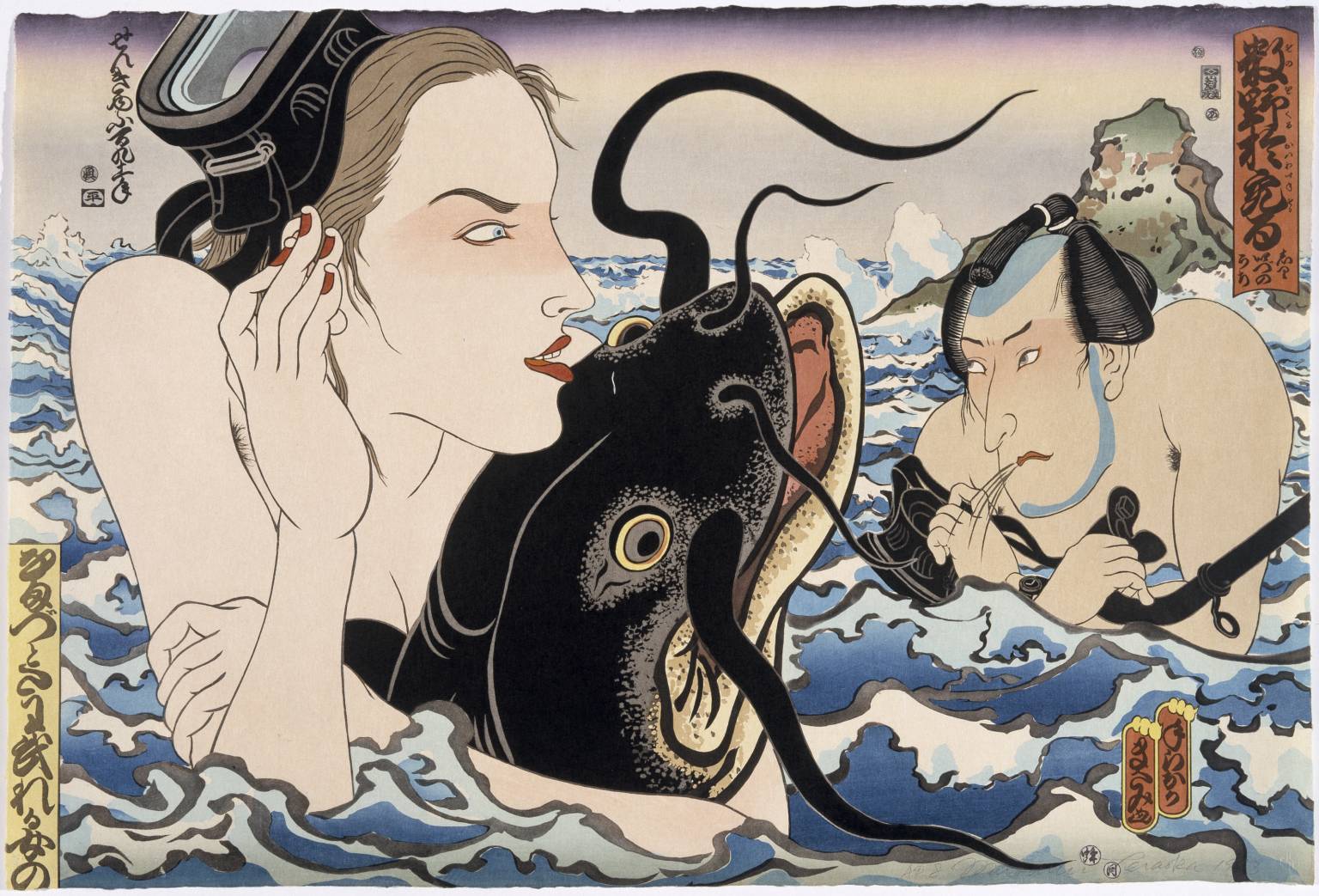 Hence this painting that imitates ukiyo-e, a genre of Japanese woodblock print popular from the 17th though 19th centuries, with all the vibes of a Roy Lichtenstein comic painting. The colliding of traditional Japanese art with American Pop art seems like it would go together like a fish and a bicycle, but it resulted in the Hawaii Snorkel Series, four paintings depicting sexy ladies and voyeuristic men that made waves in the art world.