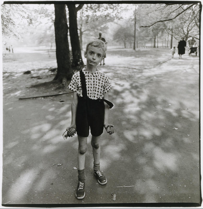 The photograph Child with Toy Hand Grenade in Central Park, N.Y.C. 1962, by Diane Arbus, shows a boy, with the left strap of his shorts hanging off his shoulder, tensely holding his long, stringy, thin arms by his side. Clenched in his right hand is a toy replica hand grenade (an Mk 2 "Pineapple"), his left hand is held in a claw-like gesture, and his facial expression is maniacal.