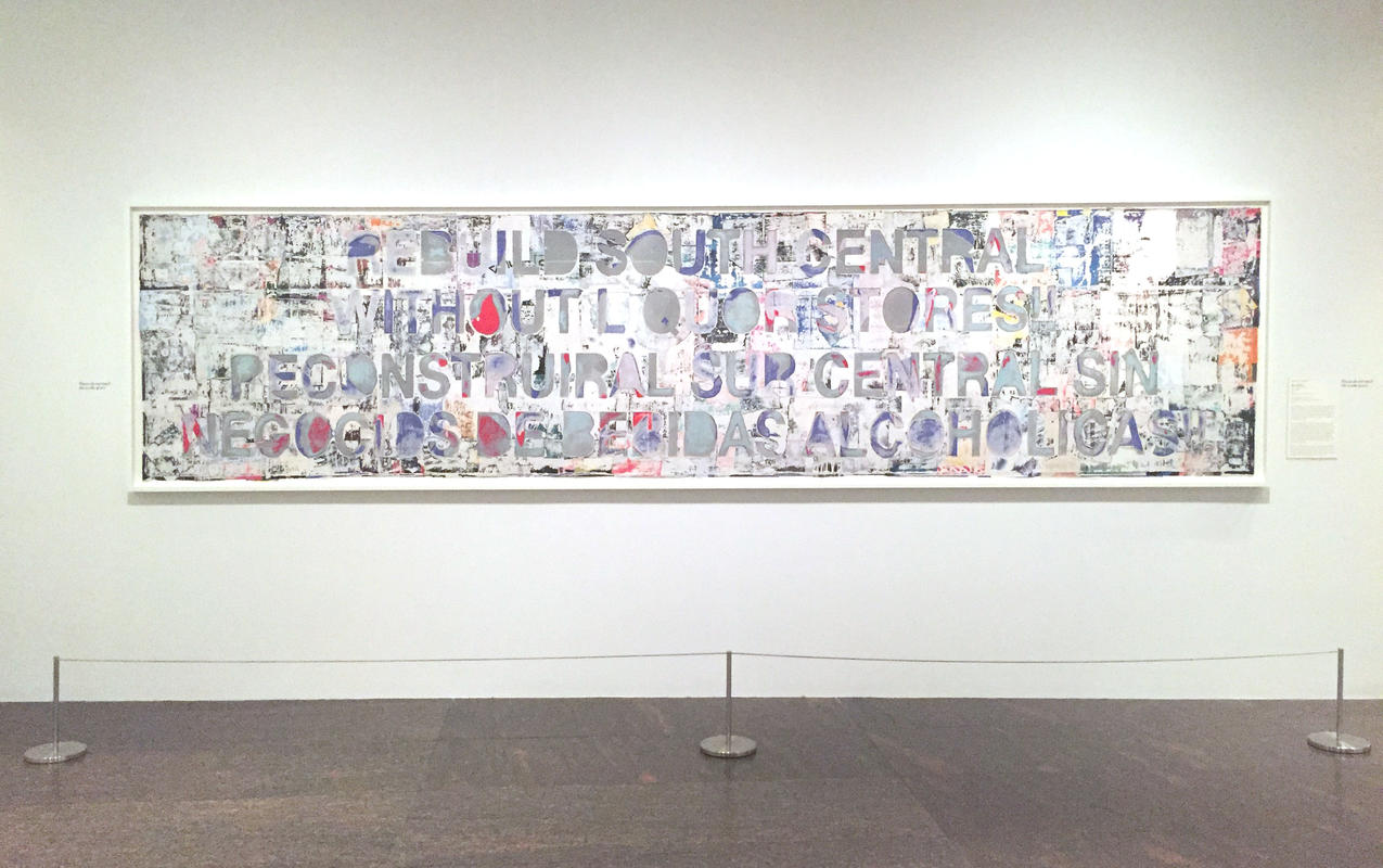 Now for our boy Mark Bradford. A native of South Central LA, Bradford is no fool to the racial class warfare that has raged on in his homeland. In fact, he has made an entire career out of publicizing life in South Central and being a voice for social change. In this piece, Bradford has enlisted his quintessential style of collaging found paper to create huge work with an even larger impact. This piece reads “REBUILD SOUTH CENTRAL WITHOUT LIQUOR STORES!! / RECONSTRUIRAL SUR CENTRAL SIN NEGOCIOS DE BEBIDAS ALCOHOLICAS!!”. This piece may have been created over two decades after the riots, yet his message is still tragically on point.