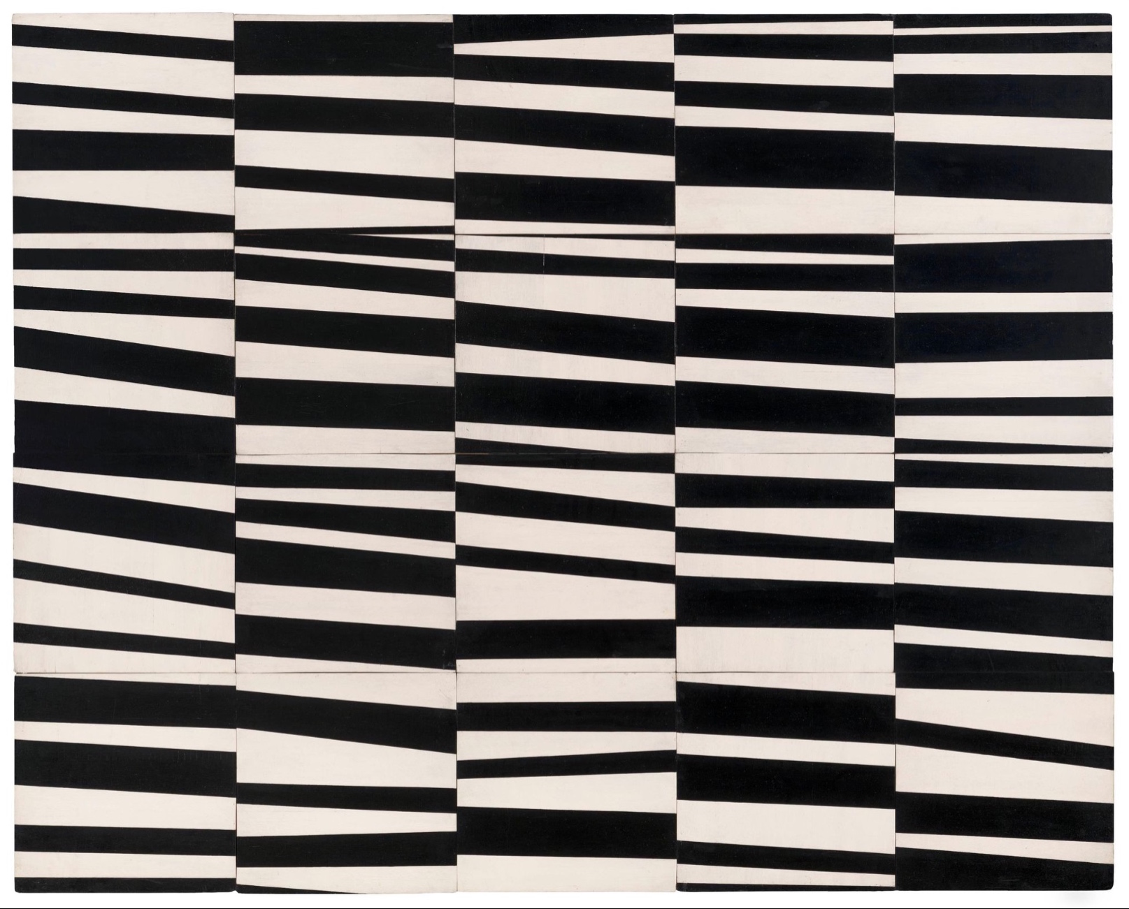 This inspired dream was the foundation of a period where Kelly’s work was characterized by gridded compositions developed through chance and chaos. The seeming order behind the large swaths of black and white brushstrokes was overturned, quite literally, when Kelly turned the composition upside down and proceeded to cut it into 20 squares. These in turn were “randomly” rearranged and the panels were reconnected into the final product.