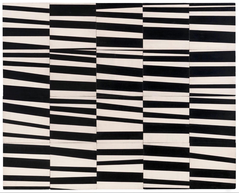 The calculated and organized chaos of this dream-state composition began while Kelly was living in Paris with Hans Arp and John Cage, guardians of artistic lawlessness. With the aid of these two purveyors of chance, Kelly’s brilliant artistic mind “dreamt he was working on a scaffold… creating an immense mural composed of square panels on which we painted black bands with huge brushes.” So his dream did portend, so he painted.