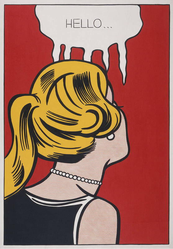 Roy Lichtenstein brings this melodramatic moment to us using Ben-Day dots, which are the areas of dotted colors that make up the pictures that you see in comic strips, and the style for which Lichtenstein is most famous. This style came about in a way you wouldn't expect. Lichtenstein’s son, when looking at a Mickey Mouse comic strip, said, “I bet you can’t paint as good as that, eh, Dad” And the rest is history. Lichtenstein’s dots are a defining part of the Pop art movement.