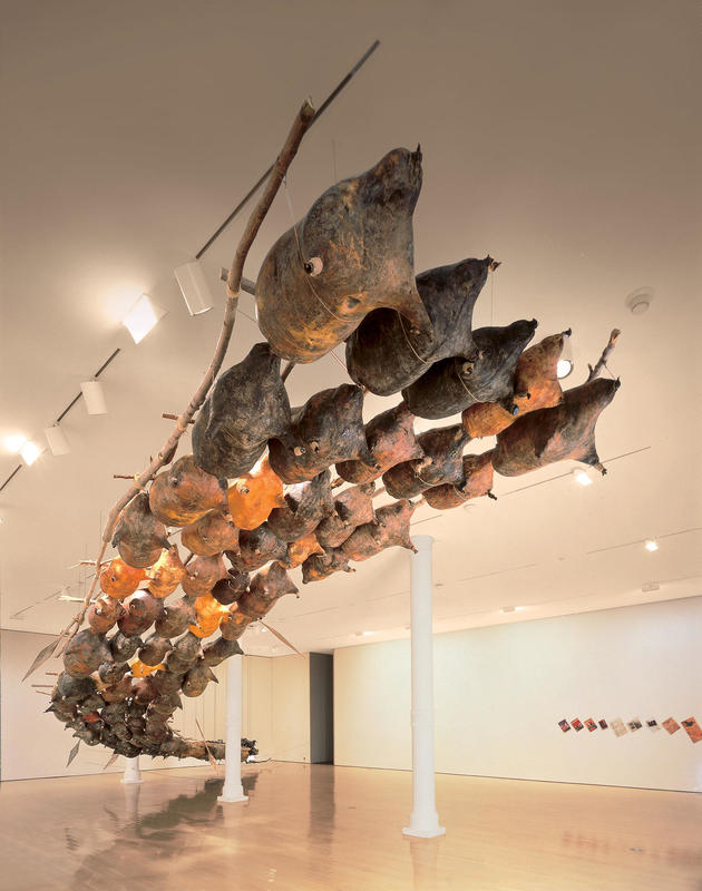 Using rope, branches, paddles, and 108 inflated sheepskins— material traditionally used by Mongolian warriors as rafts— Guo-Qiang creates a long, sloping arc that ends with three running Toyota engines. It doesn’t necessarily look like a dragon in a literal, saw-it-on-a-ride-at-Disney kind of way, but it does create an effect similar to the traditional dragons shown in Chinese festivals during the Lunar New Year.