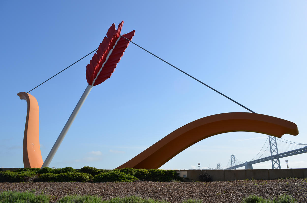 The upside down positioning of the arrow ends up working well with the environment, though. The bow and string end up looking like a ship, or alternately the suspension of a bridge which compliments the scenic view of the bay.  If you can tear your eyes away from the nudist bicycle parade.