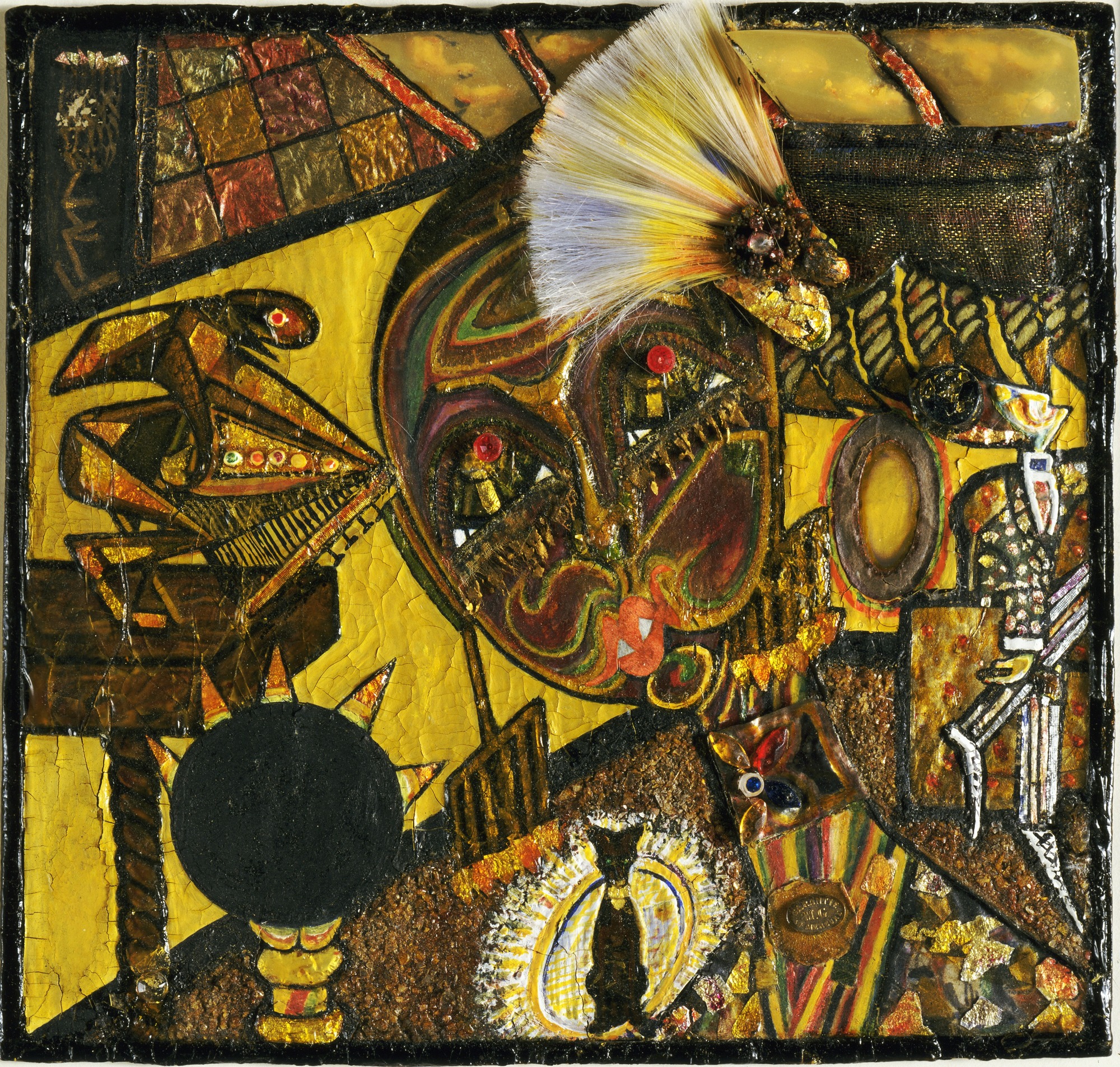 Elsa and Berenice had met in New York in 1919 and the two remained friends until the end of Elsa’s life. Abbott’s characterized Elsa as a person “like Jesus Christ and Shakespeare all rolled into one.” She recalled that Elsa “invented and introduced trousers with pictures and ornaments painted on them… [she] possessed a wonderful figure, statuesque and boyishly lean.” The two were close enough that Elsa’s dog took a particular liking to Abbott, so much so that the dog is included in this piece. Abbott is depicted with a mustache as an indication of Abbott’s androgyny. Abbott had cropped hair wore trousers, and was out as a lesbian at a time that was particularly awful to do so. She also didn’t care what people thought, much like her friend Elsa. Made of “gouache, metallic paint, and tinted lacquer with varnish, metal foil, celluloid, fiberglass, glass beads, metal objects, cut-and-pasted painted paper, gesso, and cloth on paperboard,” this piece is just as eclectic as either of these women. And though many artists and photographers, including Isamu Noguchi, tried to capture Abbott’s essence, Elsa may have nailed it the best.