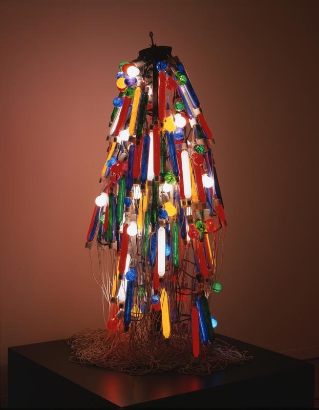 Covering Tanaka's body from head to toe, the Dress has been compared by many critics to a burqa, a garment that covers the entire body, including the face, but Tanaka peers out of it, in the very few photographs of the exhibition. Putting it on, the dress swallowed her up completely, leaving only her hands and face exposed beneath the baroque mass of electrical cords, sockets, plugs, tubes, and glass bulbs. Tanaka recalled: "I had the fleeting thought: Is this how a death-row inmate would feel?" Luckily, she was never electrocuted by her own creation.