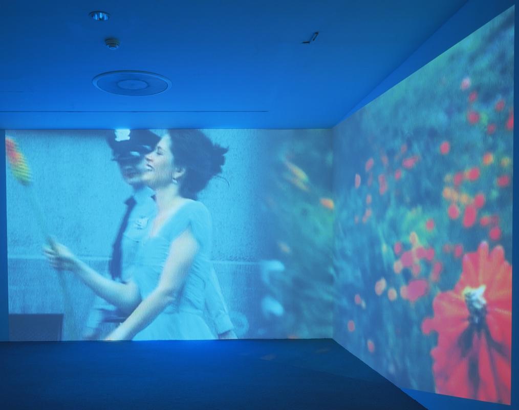 One wall of the over-corner projection shows a cheerful woman in a turquoise summer dress with high red shoes.