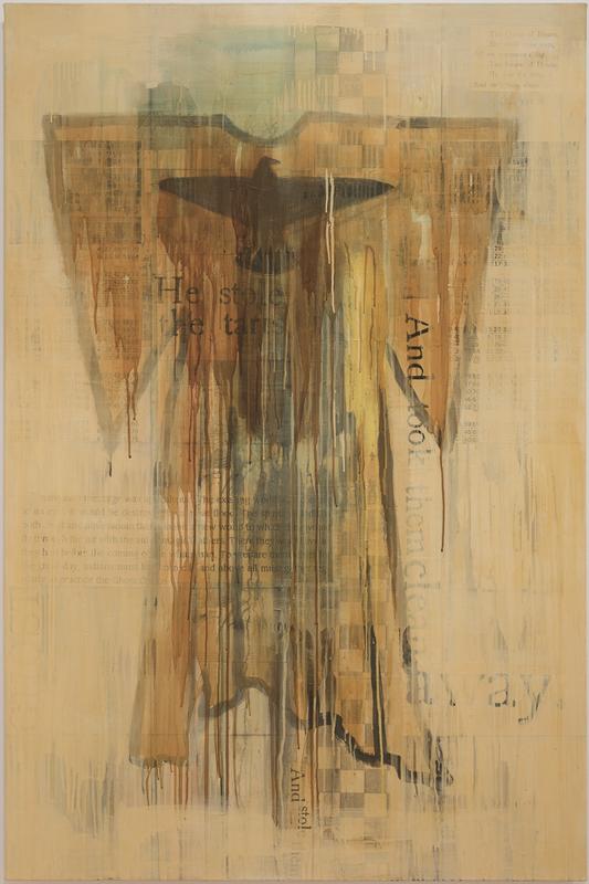 The prophecies around the Ghost Dance gave hope to homeless, ill, and hungry Native Americans at the time, and Smith tries to capture that essence not just with the dress, but also with the phrases and images collaged behind it. There’s the eagle (a messenger of prophecy), bingo cards (representing the Catholic introduction of gambling to reservations), and the Queen of Hearts nursery rhyme (a haunting little rhyme about stealing and promising not to steal).