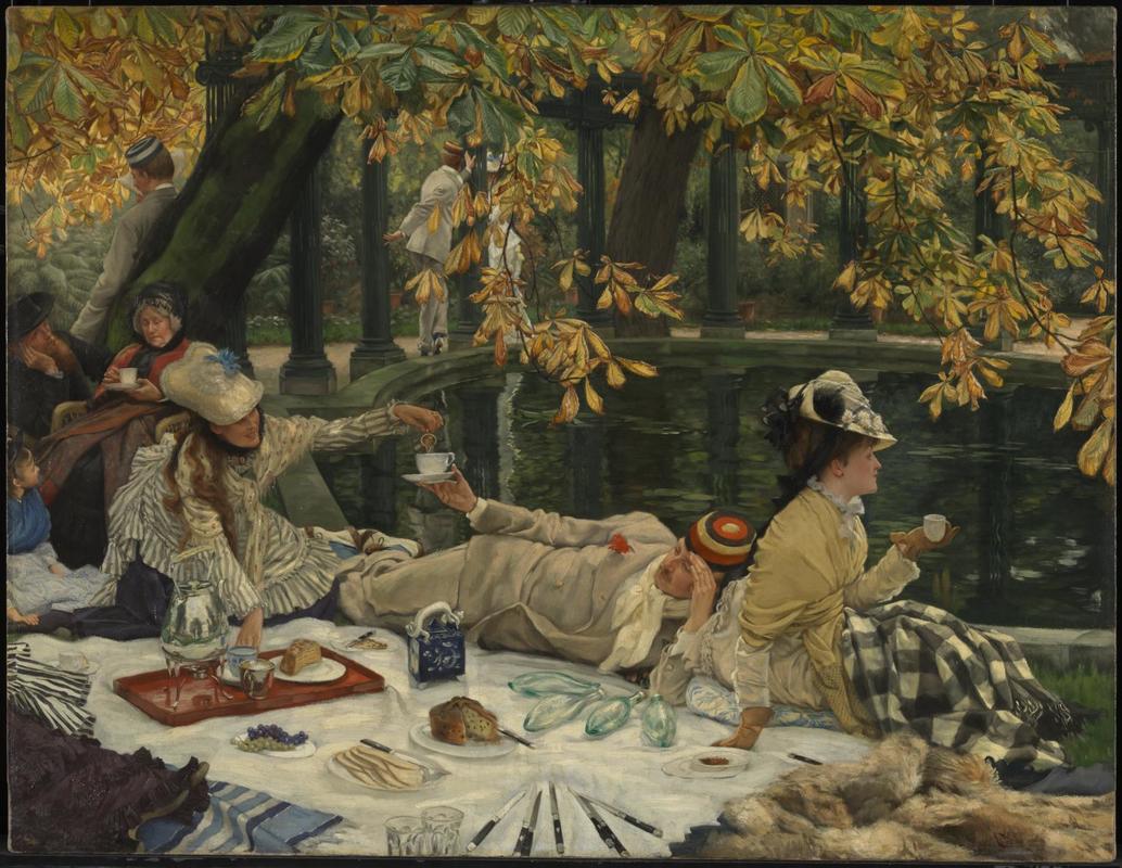 I love the complex detail that is present in this painting. The leaves have a beautiful green and yellow color, seemingly like the seasons might be changing and entering into fall. You can see the blankets that people are wrapped in, which also could be an indication of it being a bit chilly outside as they share their tea. There is a theory in this painting that the woman looking off to the distance is Kathleen Newton, a woman that artist Tissot was interested in. She looks to be thinking to herself and smiling as she gazes into the garden. Composition is very clear in this painting. The painting is clearly divided into thirds, with the picnic up close, the woman leaning against the tree, and the couple standing on the edge of the pond toward the back of the painting. I think this particular element brings value because it shows the different interactions among people as they share tea and food. Texture and color are very prevalent as well in this painting. If you look at the blankets, you can almost see/feel what type of texture they are. Likewise, we can see the clothes wrapped tightly around the people and we can imagine how that feels-to wear many layers. Color is what pulls the eyes to different parts of this painting. We notice the people in the back because there is a bright white dress. The red tray draws our eyes to the table, the reflection is shown in the water. Color brings a fun atmosphere into this painting.