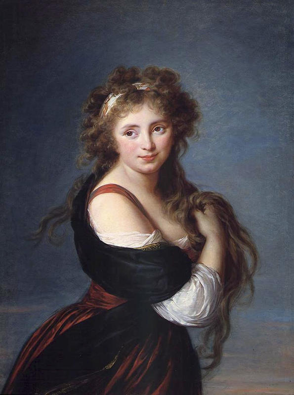 Whatever critics had to say about Hyacinthe’s wanton sluttiness, and ugly devil spawn, they had nothing bad to say about her own looks. Vigee Le Brun was famous for idealizing her subjects, but accounts of Hyacinthe’s beauty prove that Vigee Le Brun didn’t have to exaggerate. Vigee Le Brun alludes to Hyacinthe’s bad reputation, but also her natural grace, by abandoning the conventional formality for a loose, no-bra look.