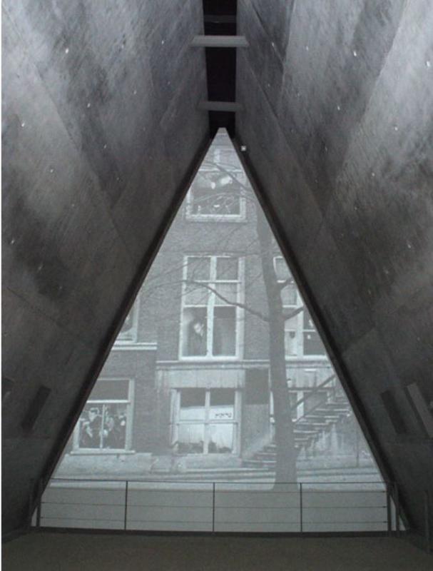 It's a triangular video that takes the visitor on a journey into the life of ordinary people, before the tragedy of the Holocaust. In the footage taken from films of the 1920s and 30s Michal Rovner includes images of a young couple ice-skating, men dancing, children jumping rope, and tailors at work. The sound in the film is authentic and includes footsteps, children singing Hatikvah (Israel's National Anthem), and violin music.