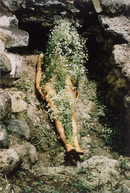This one is particularly eerie, as Mendieta’s nude body is covered in sprigs of white wildflowers, which makes it seem like a corpse in a grave. So what, right? Lots of artists take up the issue of death in their work. But not many of those artists are then allegedly murdered by their famous sculptor husband.