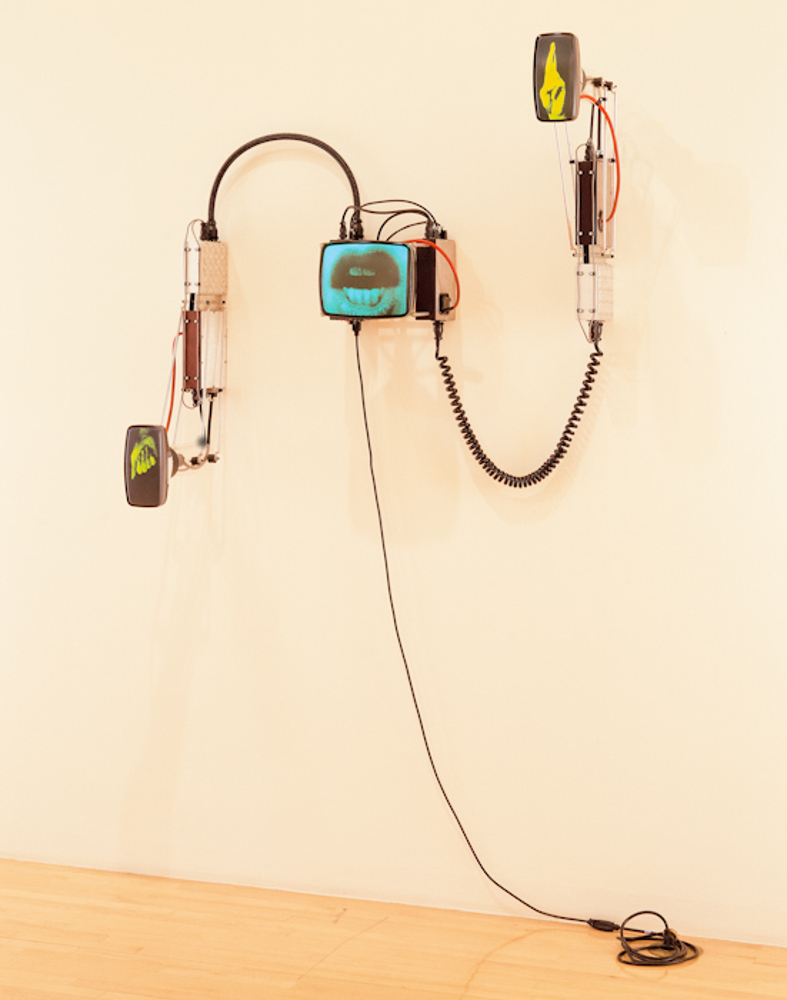The effect is at once human and machine, organic and electronic, like the monstrous next phase in the evolution of a hospital defibrillator. Alan Rath designed his own animation program for this: two hands signing mostly nonsensical phrases in ASL, attached by electrical limbs to a central mouth.