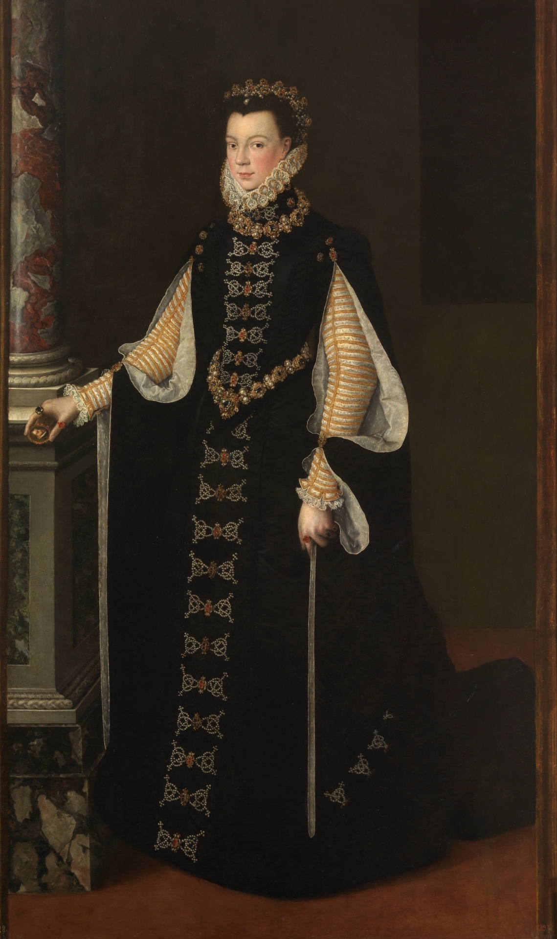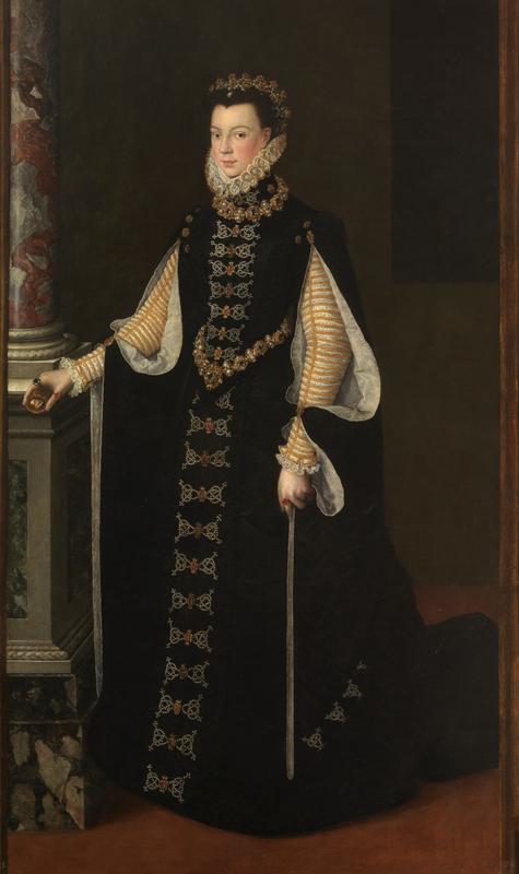 It shows Elisabeth of Valois, third wife of Philip II of Spain. Its iconography derives from Titian's Portrait of Elizabeth of Portugal, Philip's mother. Elisabeth is shown holding a miniature of Philip in her right hand, whilst her black clothing testifies to the austerity of the Spanish court at that time.