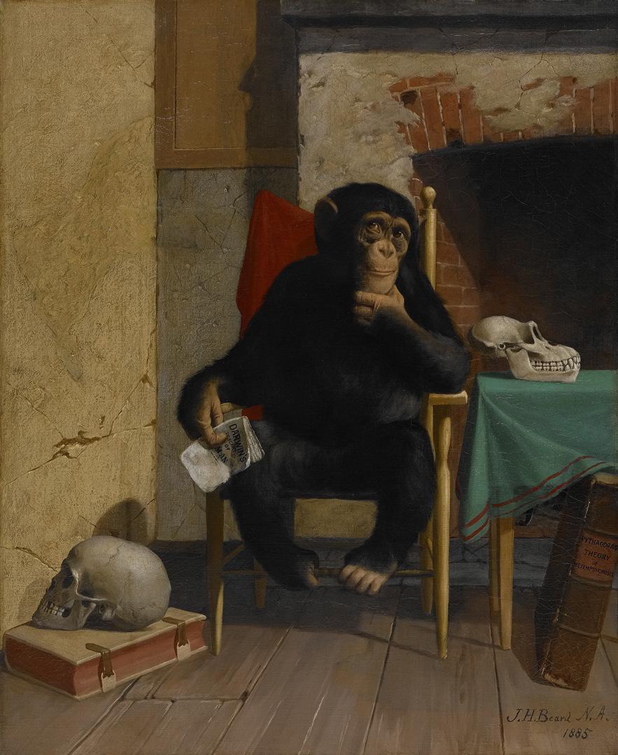 The monkey (chimpanzee, to be exact) in "It Is Very Queer, Isn't It?", in the collection of the Crystal Bridges Museum of American Art, isn’t wearing any clothing that would make him appear to have human traits, but what about the way he’s sitting in that chair? There’s also the thoughtful look on his face, not to mention the copy of Descent of Man by Charles Darwin that he holds in his hand. The hefty book on the floor, Pythagoras’s Theory of Metempsychosis, is a heavy read for anyone, let alone a monkey.