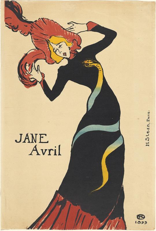 This is perhaps the most famous of Toulouse-Lautrec’s many depictions of Jane Avril, probably because she’s such a BAMF in that skin-tight black snake dress, fit for Lady Gaga at the Oscars.  There’s a publicity photo of the real Jane in the same costume and pose, but it’s hard to say if the photo inspired the poster, or if the poster inspired the photo.  The image was recreated with Zsa Zsa Gabor in the role of Jane for the 1952 film "Moulin Rouge."  Nicole Kidman’s character in the 2001 film was also very loosely based on Jane Avril.  Sartle highly recommends both movies...just don’t base your term paper on the 2001 version.