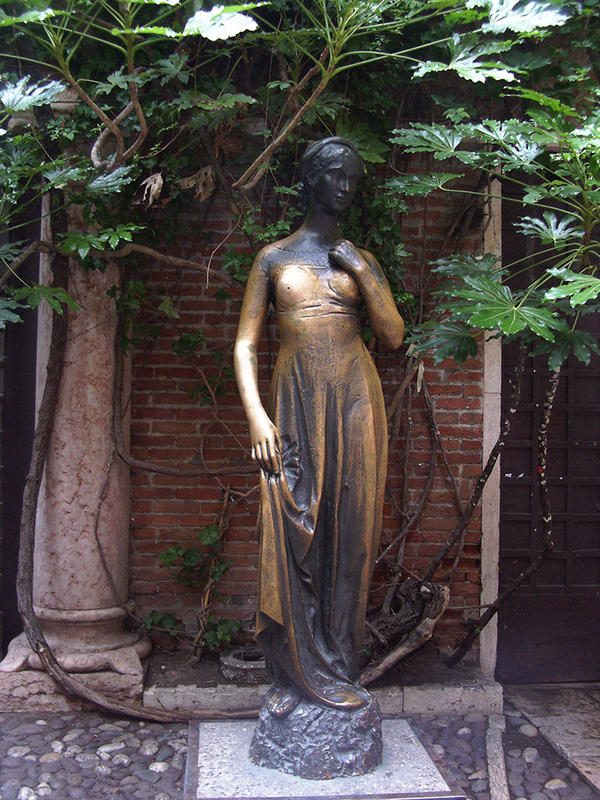 The town got the idea for commissioning the statue to go in the "Capulet" courtyard after Franco Zeffirelli directed that 1968 film of Romeo and Juliet (the one you probably slept through in high school English (or watched and loved, no judgment on the movie here)). Verona's Lions Club chapter paid for the statue and then had Costantini make a bunch of statuettes for them to give to their twinsie chapter in Stratford upon Avon, where Shakespeare was born. Really. The plaque on the statuette in England actually calls the two chapters twins.