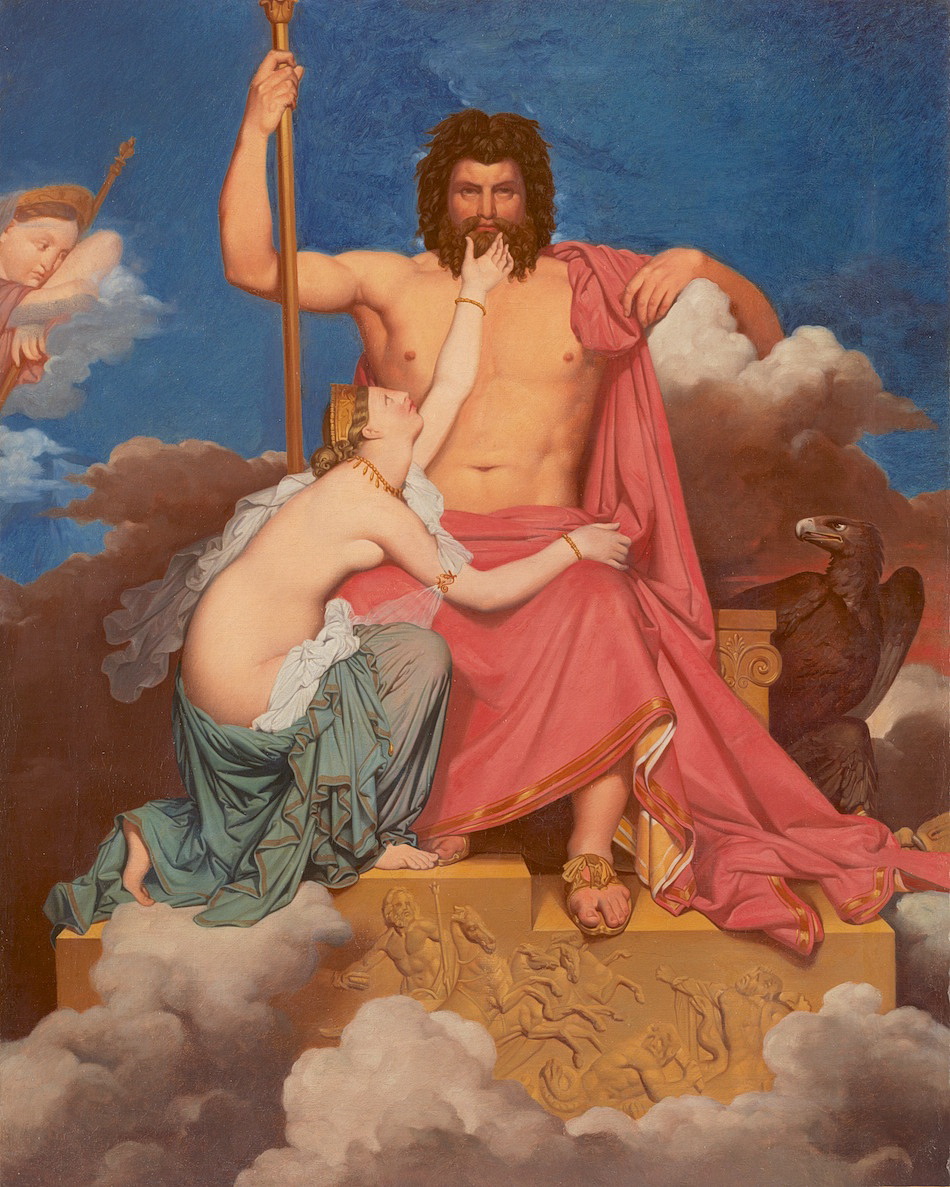For our artist, this painting was intended to be his magnus opus. Ingres had a history of receiving not-so-positive criticism and he was known for not taking it well. This piece was to establish his worth as a history painter and The Iliad was one of his favorite subjects to draw from. This scene of Jupiter and Thetis in particular wasn’t a popular one for artists at the time, though some such as George Romney had rendered the scene in ink. It was an illustration by John Flaxman that particularly inspired Ingres.